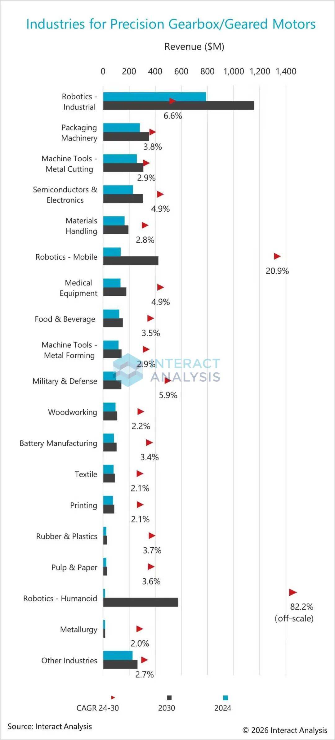 总体来看,全球细密减速器取减速电机市场正在 2025年走出 2024年的低谷,进入苏醒通道。工业机械人和挪动机械人仍是焦点增加引擎,人形机械人则正正在敏捷兴起,成为极具潜力的新兴市场。